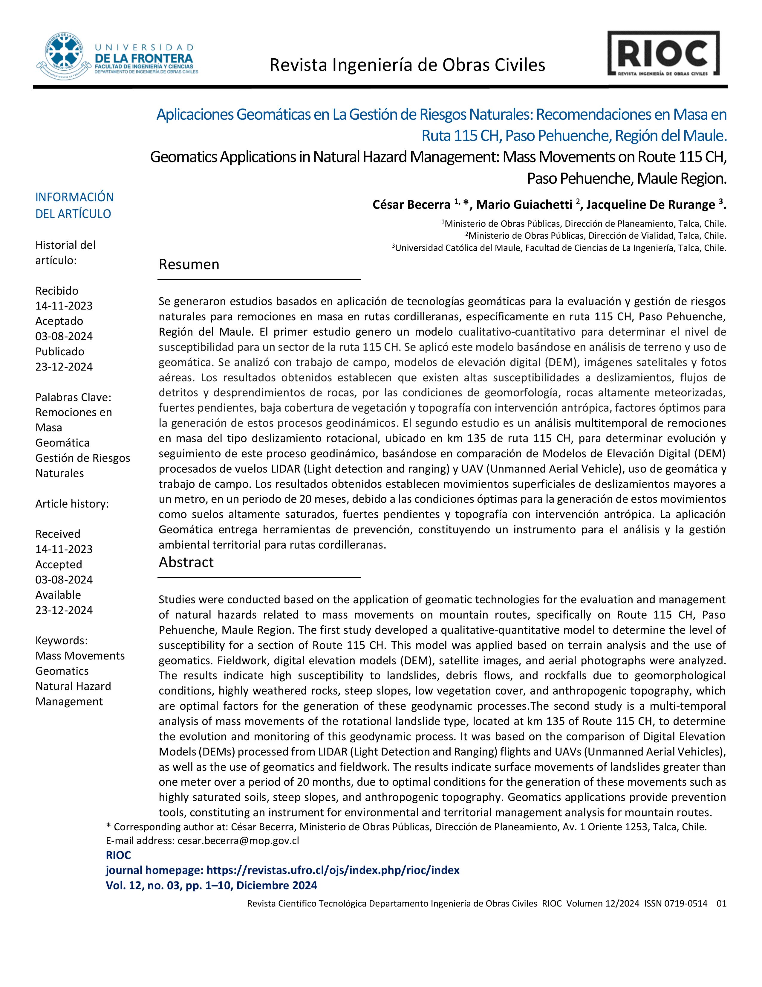 Becerra, C., Guiachetti, M., & De Rurange, J. (2024). Aplicaciones Geomáticas en La Gestión de Riesgos Naturales: Recomendaciones en Masa en Ruta 115 CH, Paso Pehuenche, Región del Maule. Revista Ingeniería De Obras Civiles, 12(3), 1–10. Recuperado a partir de https://rioc.ufro.cl/index.php/rioc/article/view/3367