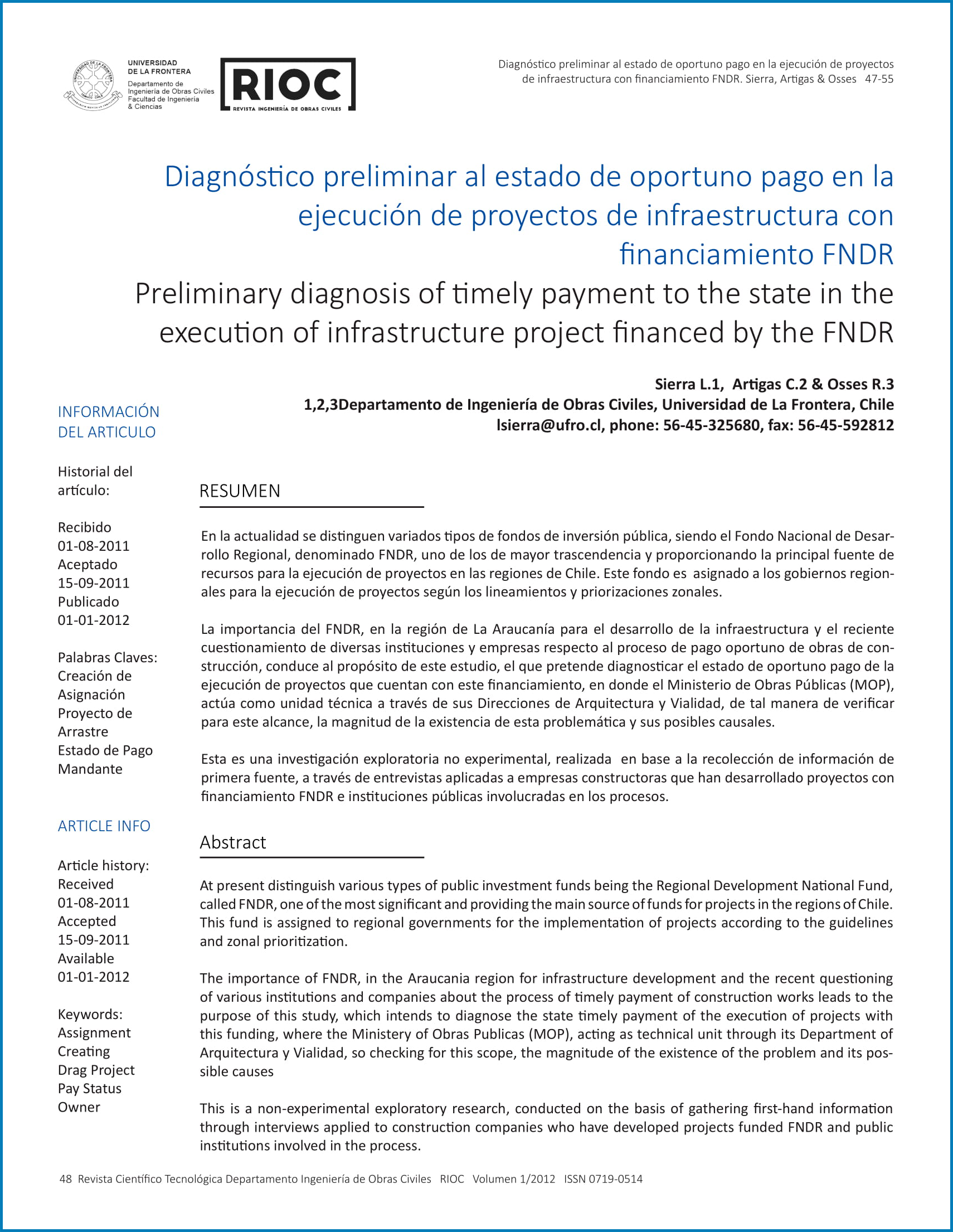 Diagnóstico preliminar al estado de oportuno pago en la ejecución de proyectos de infraestructura con financiamiento FNDR.